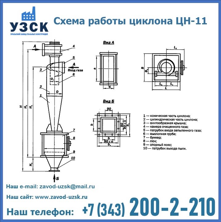 При этом ощутимой разницы в цене между универсальным и узконаправленным, подобранным в соответствии с конкретными техническими требованиями циклоном, нет. Стоимость воздухоочистительного оборудования типа циклон обусловлена маркой и толщиной стали, из которого он изготовлен, сложностью и специфичностью конструкции, наличием дополнительного оснащения (бункер, улитка и другие). При необходимости, на заводе УЗСК в Ельце будет изготовлен циклон по индивидуальным техническим чертежам заказчика.